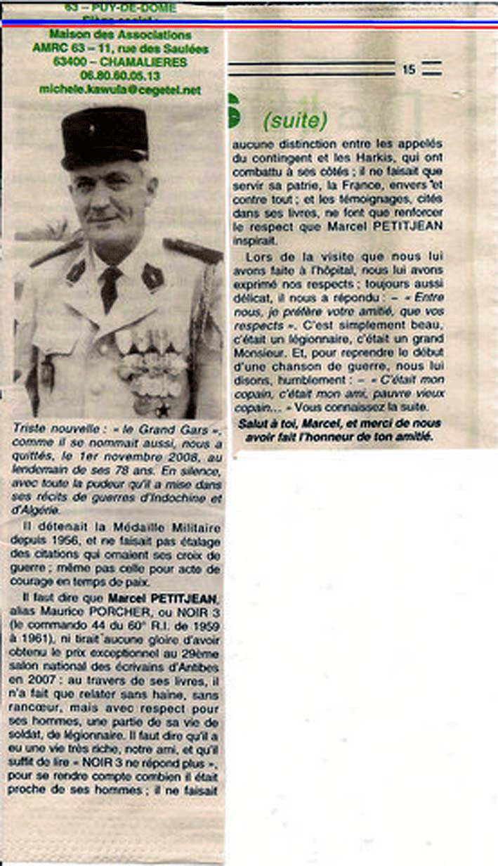 Bonjour monsieur VINCENT, Ils ont écrit Bury Marcel ancien du commando 44 basé au camp des petits cheminots les guerilleros du commando de chasse V44 le journal d 'un appelé en ALGERIE 1959 ET 1960( Livre de 680 pages avec plus de 1000 photos dont 400 en couleurs pour un poids de 2 kilos son adresse MR .Marcel BURY BP.2 67600 Baldenheim Marcel Bury " pèlerin infatigable "recherche aussi et toujours ses anciens camarades du commando 44... Petitjean Marcel ancien du commando ;ancien légionnaire ;résistant à vie à l 'abandon de l'ALGERIE FRANCAISE vous conte sa vie et ses combats à travers plusieurs ouvrages Noir 3 ne répond plus Les Mémoires du grand gars La Ruade Son adresse PETITJEAN Maraval 81170 Marnaves pour étoffer le site Recherche des photos du village Des écrits et des photos sur ROISSY Des écrits sur la vigne, l 'élevage , les cultures Des photos de chasse et des écrits . Des informations sur les différents régiments stationnés dans le village entre 1954 1962 Sur les Eaux et forêts Des gardes champêtre Du docteur MOUGEOT De l 'état civil De la S.A.S Des écoles le site sera mis à jour tous les 6 mois en Janvier et Juin de chaque année sauf pour les nouvelles la mise à jour se fera tous les mois Rectifications du site fait en novembre 2010 Nouvelle rubrique sur la SAS Ajout de photos offertes par D. Suchet ancien du 60REI AJOUT de photos de Ghislaine Saliba dans la rubrique le petit cheminot Rectification du site fait en avril 2011 Rectification du site fait en décembre 2011