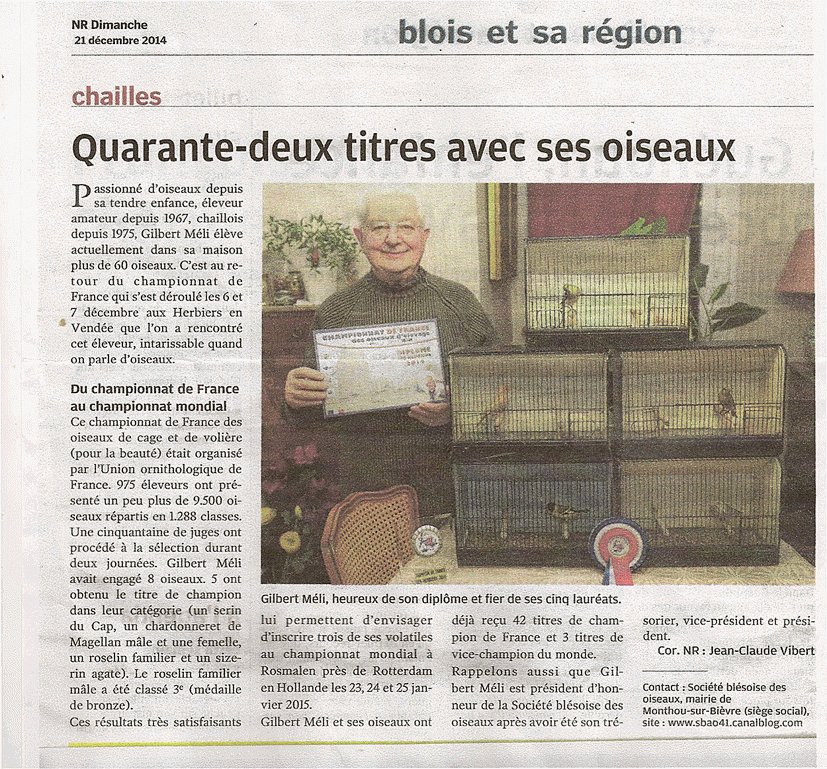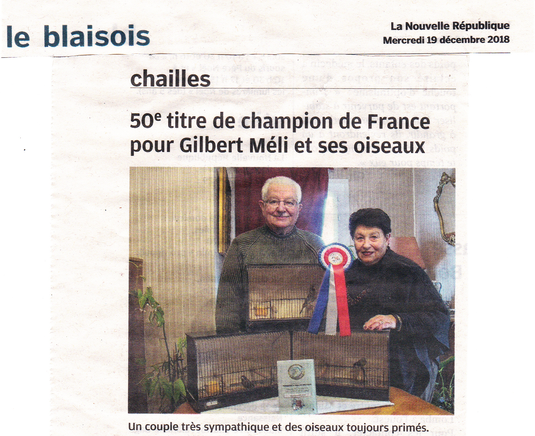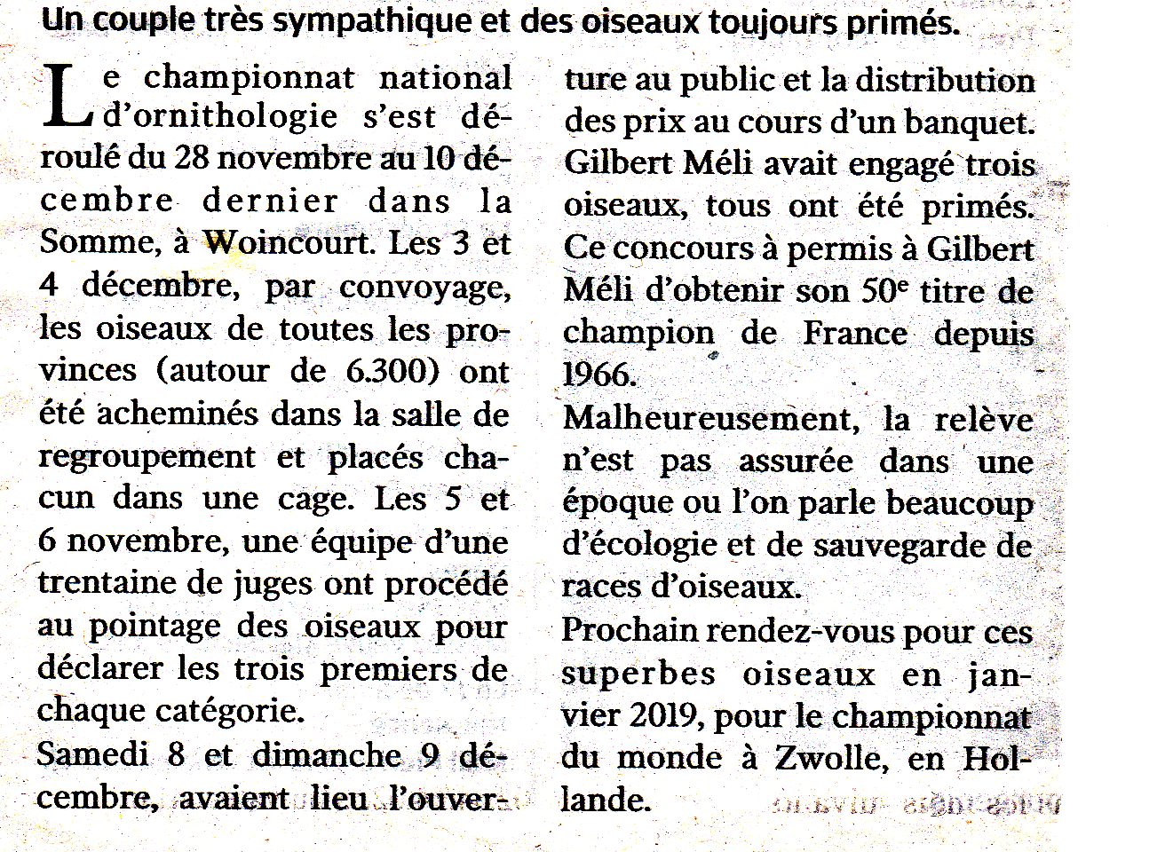 sympathisants, bonjour ! A bientôt. Article paru sur Gilbert méli " Gilbert passionné depuis sa jeunesse à Ainsenour a détenu différents titres vice champion du monde champion de FRANCE dans les catégories canaris couleurs ,exotiques bec droit ,hybrides