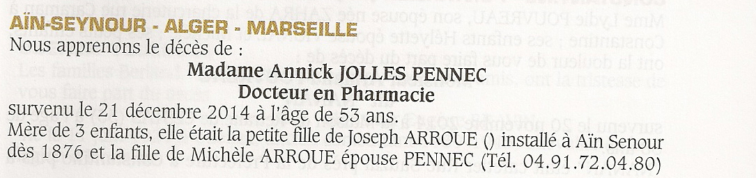 Annonce du décès d 'Annick JOLLES PENNEC par André et la revue Ensemble Malheureusement pour nous ce début d'année s'est assombri puisque ma soeur, Annick JOLLES PENNEC, docteur en pharmacie est décédée le 21 décembre 2014 dernier à l'age de 53 ans. Elle laisse dans le chagrin, Charles son mari, et ses 3 enfants, Marc, Eric et Paul. Elle était la petite fille de Joseph ARROUE installé à Ain Seynour dès 1876, et la fille de Michèle ARROUE ep PENNEC, ma mère. (TEL 04-91-72-04-80).