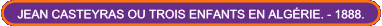 Titre : JEAN CASTEYRAS, AVENTURES DE TROIS ENFANTS EN ALGÉRIE. Description : 307 pages, 634 Ko. Éditeur : J. Hetzel et Cie, Paris 1888. Auteur : Adolphe BADIN. Voici un ouvrage de divertissement, destiné aux visiteurs de ce site qui ont gardé une âme d'enfant ; il peut être comparé au « Tour de France par deux enfants », où encore au très connu « Les enfants du capitaine Grant »... avec un petit peu de talent en moins !!! Ici, nos trois orphelins parcourent l'Algérie à la recherche de leur oncle (qui ressemble au fameux Bombonnel) ; c'est délicieusement suranné ! |