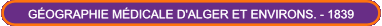 TITRE : GÉOGRAPHIE MÉDICALE D’ALGER ET DE SES ENVIRONS. Description : 177 pages, 521 ko. Auteur : M. BONNAFONT Docteur en médecine; Chirurgien aide-major de l’armée d’Afrique; Professeur d’anatomie à l’ex-hôpital d’instruction d’Alger ; Chirurgien en chef d’ambulance aux expéditions de Constantine, de la Tafna, de Stora, de Sétif, etc. ; Chevalier de l’ordre royal de la Légion d’Honneur ; Membre correspondant de l’Académie royale de Médecine de Paris ; de la Société royale de Médecine de Marseille. Une curiosité qui permet, s’il en était besoin, de mesurer les progrès de la médecine en 170 ans ! J’aurais pu placer cet ouvrage sur le rayon « Documents » ou « essais », mais les théories du Docteur Bonnafont sur brouillards et les « miasmes pestilentiels » des marais, semblent tellement farfelues à notre époque que j’ai préféré ce lieu de rangement !