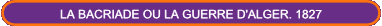 Titre : LA BACRIADE. Description : 87 pages, 121 ko. Auteurs : Barthélemy et Méry. Il s’agit d’un pastiche de l’Iliade dans lequel la belle Hélène et remplacée par… Nathan Bacri ! Après que « le coup d’éventail », ait été asséné, Bacri se pavane dans les quartiers chics de Paris tandis que le dey d’Alger Hussein essaye de le récupérer à tout pris en envoyant une ambassade en Égypte, où (peut-être !?) en envoyant un commando en France pour l’arrêter. Pendant ce temps, la flotte française fait le blocus Alger. En lisant cette pochade, il ne semble pas que les auteurs prennent l’affaire au sérieux et anticipent la prochaine expédition d’Alger ! A la réflexion, je me demande si « La Bacriade » n’a pas été écrite par Roland Bacri lui-même… en trichant sur les dates ! Une plaisanterie de plus de sa part ! |