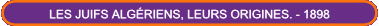 Titre : LES JUIFS ALGÉRIENS, LEURS ORIGINES. Alger 1898. Description : 72 pages, 212 ko. L’auteur : Henri Garrot. Il s’agit d’un petit ouvrage antisémite, écrit sans doute dans l’entourage du fameux Édouard Drumont. « En contact avec nous depuis 1830, les juifs, espions de nos armées aussi bien que de celles des deys, servant les deux partis, ils n’avaient pris aucune part au mouvement d’amélioration sociale apporté par nos armes. (L’auteur) » |