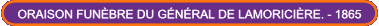 Titre : ORAISON FUNÈBRE DU GÉNÉRAL DE LAMORICIÈRE. - 1865 Description : 194 ko, 65 pages. Auteur : Monseigneur Dupanloup. Félix Dupanloup (1802-1878), spécialiste de l'éducation des jeunes filles, directeur du petit séminaire de Saint-Nicolas-du-Chardonnet était un orateur et polémiste de talent. Evêque d'Orléans à partir de 1849, il fut sous le règne de Napoléon III, le chef des catholiques libéraux et se prononça contre l'opportunité de la définition de l'infaillibilité pontificale. Il fut Député à l'assemblé nationale de 1871 (où il fit voter la loi sur la liberté de l'enseignement supérieur) et Sénateur inamovible en 1876. Il démissionna de l'Académie française, dont il était membre depuis 1864, lors de l'élection de Littré. Cette oraison funèbre est un petit chef-d'oeuvre d'éloquence. Elle est cependant moins connue que la chanson de carabin qui relate toutes sortes de performances « amoureuses » commises par un homonyme. |
