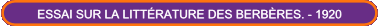 Description : 426 pages, 820 ko. Titre : ESSAI SUR LA LITTÉRATURE DES BERBÈRES. - 1920 Auteur : René BASSET. DIRECTEUR DE L'ÉCOLE SUPÉRIEURE DES LETTRES D'ALGER DIRECTEUR-ADJOINT DE L'ÉCOLE SUPÉRIEURE DE LANGUE ARABE ET DE DIALECTES BERBÈRES DE RABAT. MEMBRE DES SOCIÉTÉS ASIATIQUES DE PARIS, LEIPZIG ET FLORENCE, DE LA SOCIÉTÉ DE LINGUISTIQUE DE PARIS, ETC. René Basset, grand connaisseur de la langue et de la littérature arabe, et berbère accomplit un immense travail dans les domaines linguistiques berbère, arabo-islamique et éthiopien, ainsi que sur les terrains de l'histoire des religions ou des études ethnographiques et folkloriques. Ses ouvrages sont tellement spécialisés, qu'ils n'ont pas leur place sur ce site… sauf « La religion des berbères » et celui-ci que René basset présente de la façon suivante : « Ce travail n'est pas adressé aux seuls berbérisants — qui n'en ont pas besoin — mais à tous ceux qui s'intéressent aux éludes de folklore ou à l'Afrique du Nord » Cet essai, qui a fait autorité à l'époque de son édition, est encore incontournable. L'ouvrage est divisé en 4 parties : Ce dernier chapitre est le plus développé. Je complèterai bientôt cette étude par un autre ouvrage de René Basset : « Contes populaires Berbères ». Je signale la réédition du célèbre ouvrage de René Basset : 1001 contes, récits et légendes arabes Coffret 2 volumes 52,25 €. (Une suite aux mille et une nuits ?!)