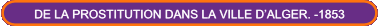 Titre : DE LA PROSTITUTION DANS LA VILLE D'ALGER.- 1853 Description : 229 pages, 407 ko. Auteur : E. - A. DUCHESNE, Docteur en Médecine; Membre du Conseil d'Hygiène publique et de Salubrité ; Membre de la Société Impériale de Médecine de Bordeaux et de Poitiers. Cet ouvrage doit être consulté comme une curiosité ; il ne présente aucun caractère de type scientifique, (sauf en ce qui concerne les indications de type médical ?!?!), bien qu'il soit écrit par un médecin... Il nous permet de d'imaginer ce que les français d'Alger pensaient du comportement des femmes indigènes à l'époque ! |