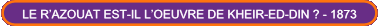 Titre : LE R'AZOUAT EST-IL L'OEUVRE DE KHEIR-ED-DIN ? - 1873 Description : 197 ko, 47 pages Auteur : HENRI-DELMAS DE GRAMMONT. Né en août 1830, H. - D. de Grammont a passé la majeure partie de sa vie d'adulte en Algérie. Après avoir fait des études de droit, il vint en 1850 faire son service en Algérie. En 1855, il participa comme officier à la guerre de Crimée. Il revint s'installer en Algérie de 1859 à 1864, puis définitivement en 1871. De cette date jusqu'à sa mort en 1892, il vécut à Alger où il fut Membre de la «Société Historique Algérienne», puis président de cette Société en 1878 et se consacra entièrement à ses recherches sur l'histoire d'Alger à l'époque ottomane. Son nom est resté attaché à la «Revue Africaine». La lecture de cet ouvrage ne se justifie que si l'on a consulté auparavant « la fondation du royaume d'Alger », à télécharger à partir de la page « documents ». |