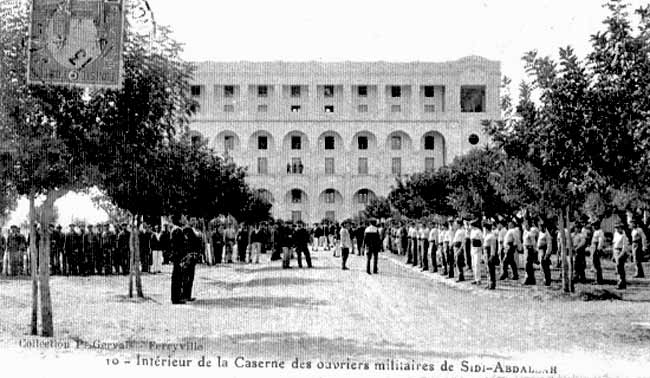 Vers 1900, l'intérieur de la caserne des ouvriers militaires Les ouvriers militaires, faisaient leur service militaire pour débuter la construction de l'arsenal et des installations militaires de Ferryville. Cet engagement permettait à ces ouvriers militaires de faire moins de temps de service militaire que les simples appellés.