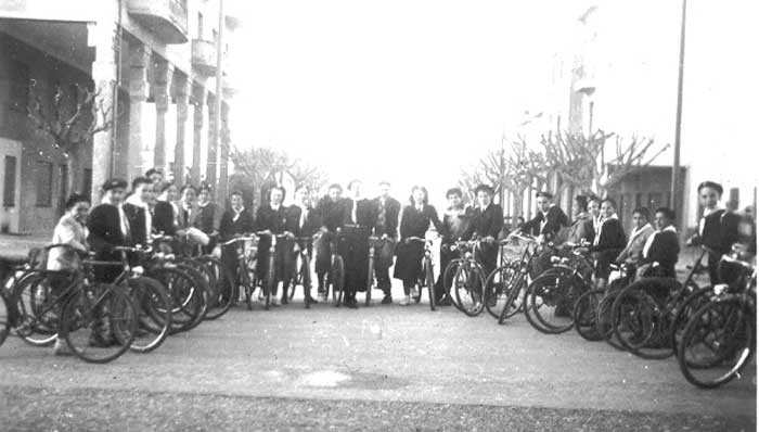 Départ d'une excursion en bicyclette dans la rue des arcades