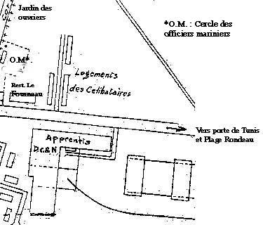 | Ce plan de Ferryville date de la fin des années 1930, par la suite il a été sommairement mis à jour (Rue Charles de Gaulle, ce nom n'a pu être donné à cette rue qu'après la guerre de 1939 - 1945). j'ai fait moi-même quelques corrections particulièrement des bâtiments détruits pendant la guerre, ex. au Temporaire 1 il y avait 3 rangées de batiments avant guerre qui furent détruits, après la guerre en 1943 -44, la marine a reconstruit 2 rangées de batiments, la rangée le long du CFI entre la rue de l'hôpital et le boulevard Carnot n'a pas été reconstruite, le BMR a été construit après guerre le long du boulevard Carnot ,en face de l'entrée du stade de la marine, entre le temporaire 1 et le CFI. Après la guerre le foyer du marin a été supprimé, le bâtiment a servi de restaurant au cercle des sous-officiers mariniers (coin avenue de France - boulevard Carnot). |