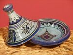 Le Tajine, très beau plat creux rond, coiffé d'un couvercle en forme de cône pointu inspiré del'artisanat arabe. Poterie en terre cuite quelquefois richement coloriée ou en métal finement ciselé (que l'on peut remplacer, par un poêlon en fonte ou en terre, allant au four) pour réaliser des plats, qui ont pris le nom de tajines divers, dans la pure tradition de la cuisson à l'étouffée dans la chaleur du four.